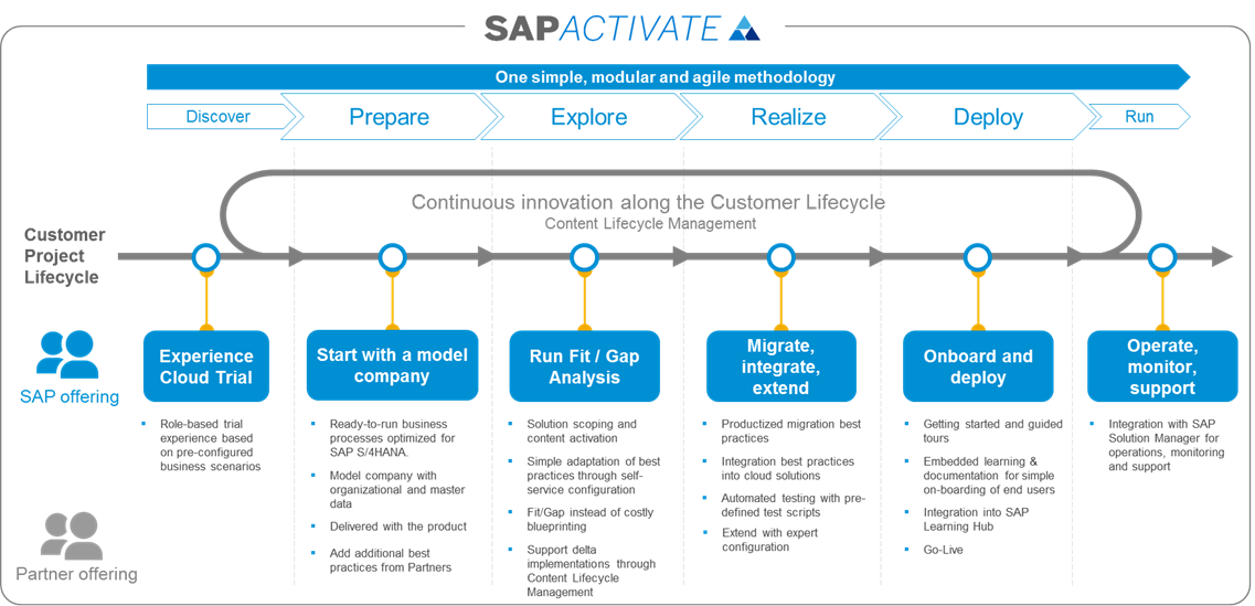 This Discover phase will help you consider and experience SAP S/4HANA before starting a project to implement SAP S/4HANA. In this phase, you develop strategies and road-map you use on the implementation journey. Experience SAP S/4HANA with preconfigured SAP Best practices-based Cloud and On-premise trials